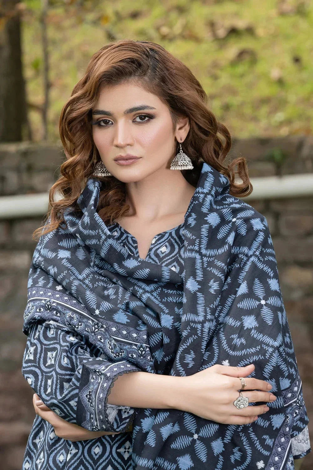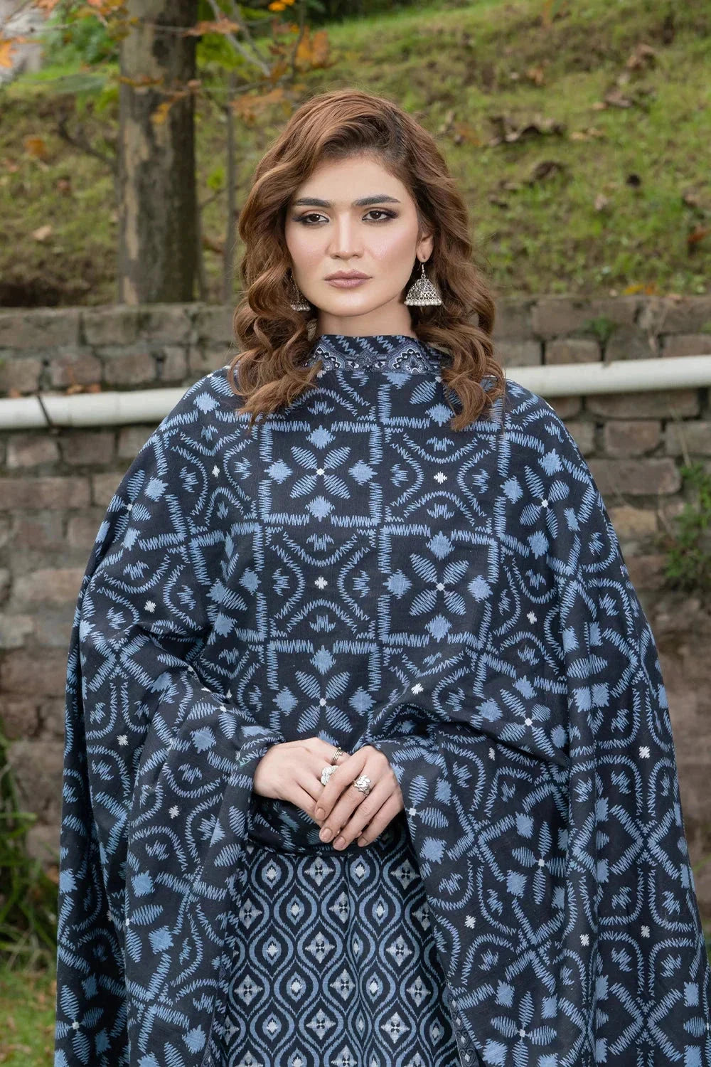 The suit features a beautifully printed khaddar fabric with intricate patterns that are both stylish and versatile for various occasions.