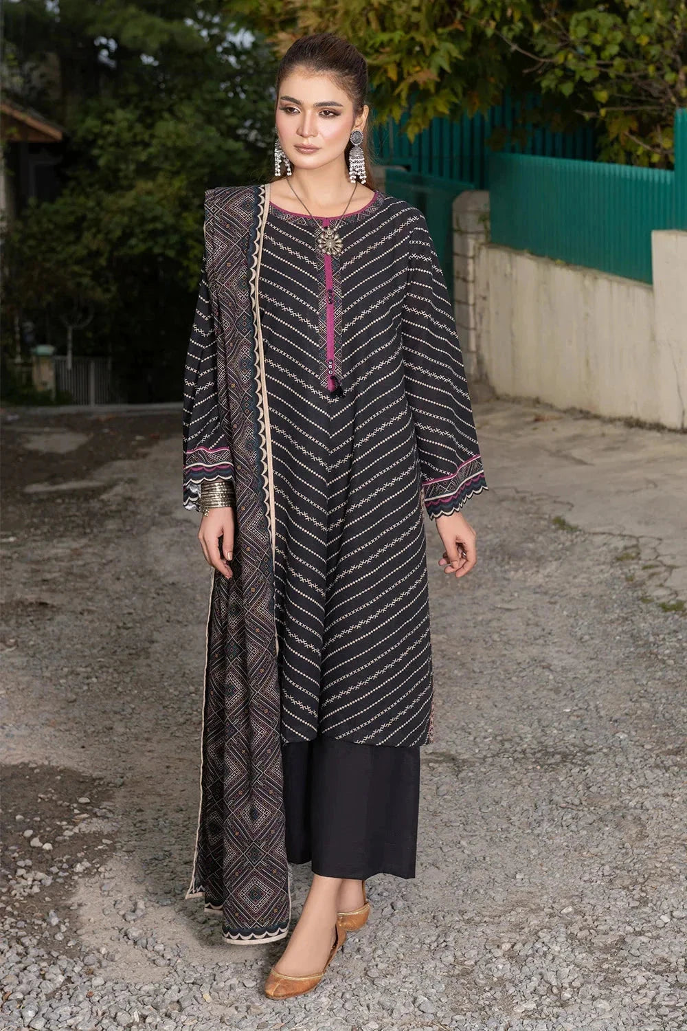 The suit features a beautifully printed khaddar fabric with intricate patterns that are both stylish and versatile for various occasions.