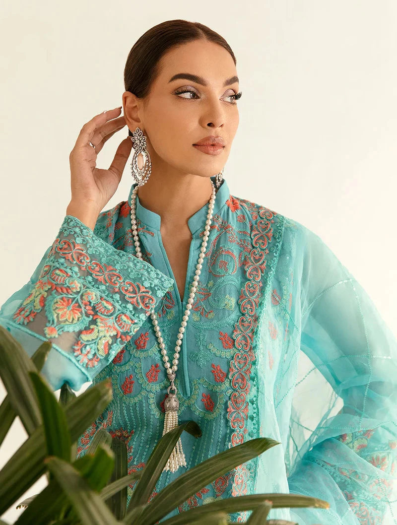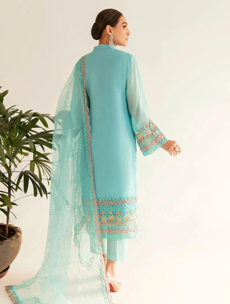 It calls a classy composition which is encrusted over this soft chiffon dress rendered in lavender color. Its shirt and dupatta have been crafted in a classic silhouette pattern. The graceful both pairs are adorned with exquisite embroidery at front and sleeves of shirt and dupatta are portraying with delicate shades and luxury motifs. Paired with a gracefully elegant grip dyed trouser in identical shade. A refined outfit for your all festive occasions.