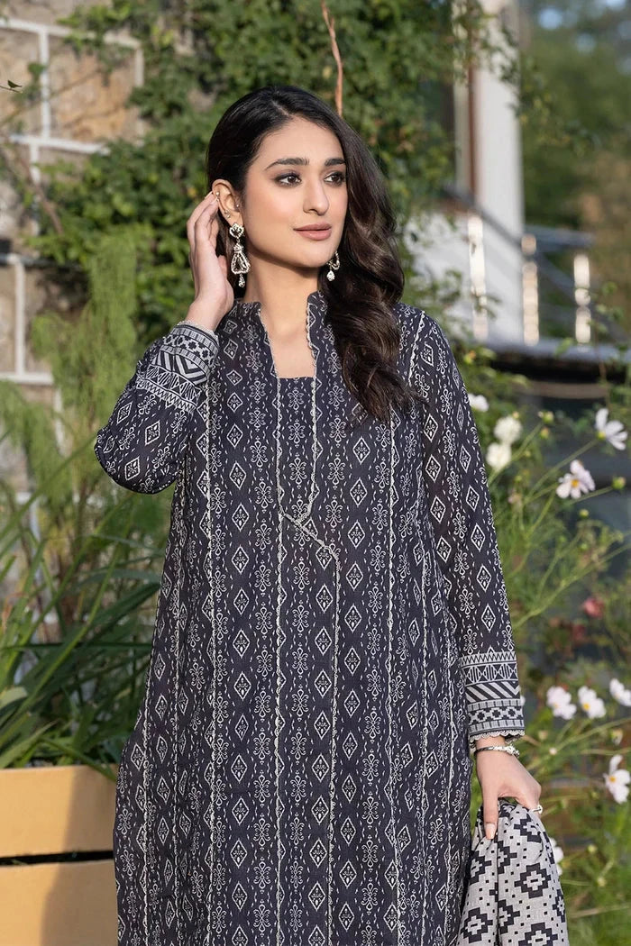 The suit features a beautifully printed khaddar fabric with intricate patterns that are both stylish and versatile for various occasions.
